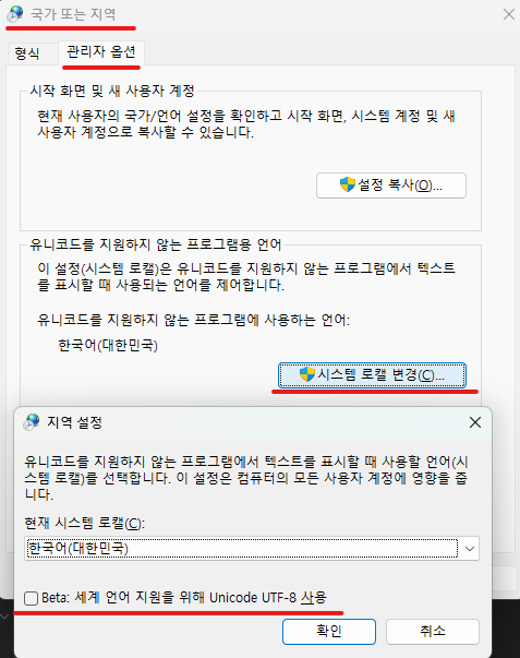 윈도우에서 국가 또는 지역 -> 관리자 옵션 -> 시스템 로캘 변경 -> "Beta:세계 언어 지원을 위해 Unicode UTF-8 사용" 체크 후 재부팅