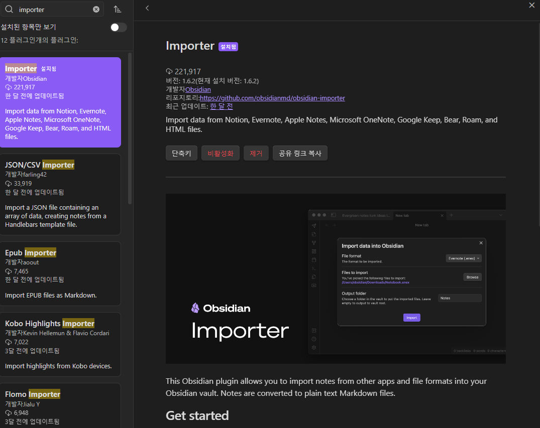 여기서 the importer 라는 문구가 눈에 들어와서 바로 확인을 해보니 옵시디언에서 제공하는 플러그인! 바로 사용해야죠