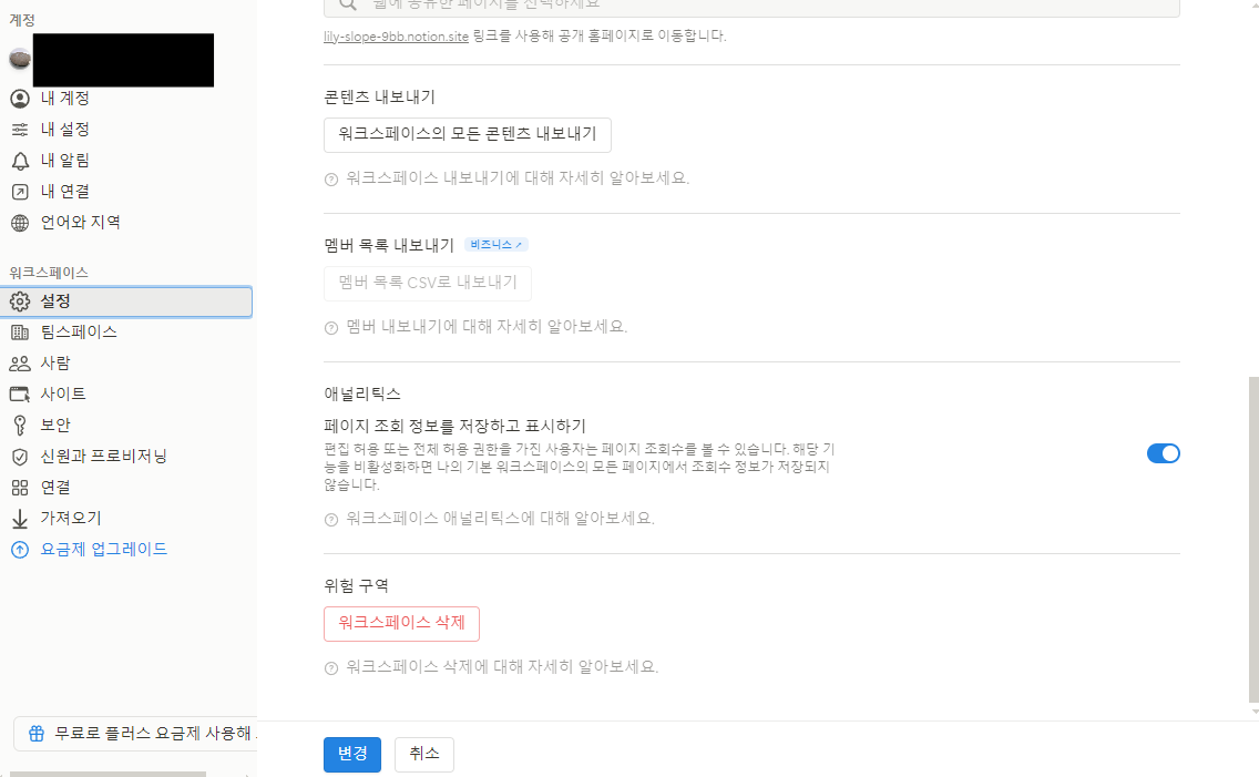 설정과 멤버 -> 설정 -> 콘텐츠 내보내기 -> 내보내기 형식 : HTML