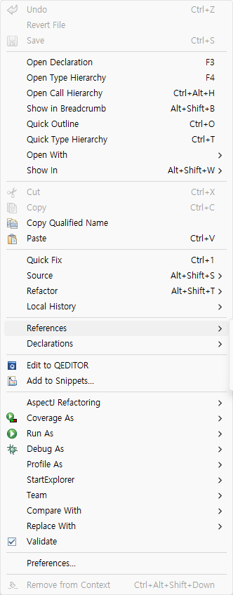 이클립스 메서드 레퍼런스 찾기 게시 2024/06/13 업데이트 2024/06/26 By 개발구리🐸 1 분읽는 시간이클립스에서 어떤 메서드를 사용하는지를 찾는 방법!찾고자 하는 메서드명에 커서를 두고 우클릭 References 에서 찾을 범위를 선택하면 해당 메서드를 호출하여 사용하는 부분이 목록에 나옵니다!1. 메서드명에 커서를 놓고 우클릭하기2. References 에서 검색 범위 선택하기 ide, eclipse eclipse 이 기사는 저작권자의 CC BY 4.0 라이센스를 따릅니다. 공유하기